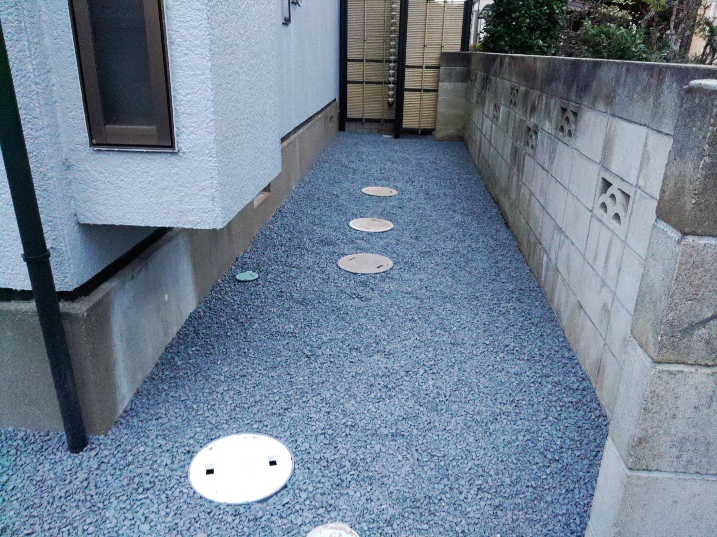 犬走り全域も、防草シートと砂利敷きで