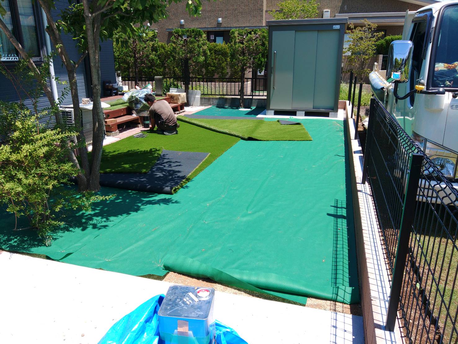 防草シートを敷き詰め、人工芝を張っていきます。