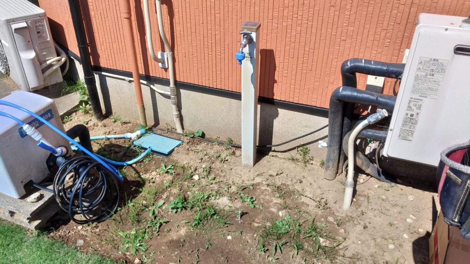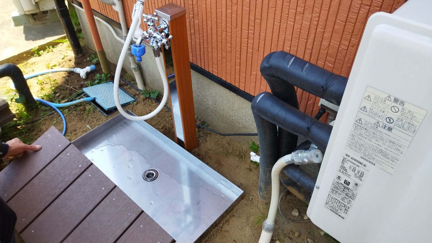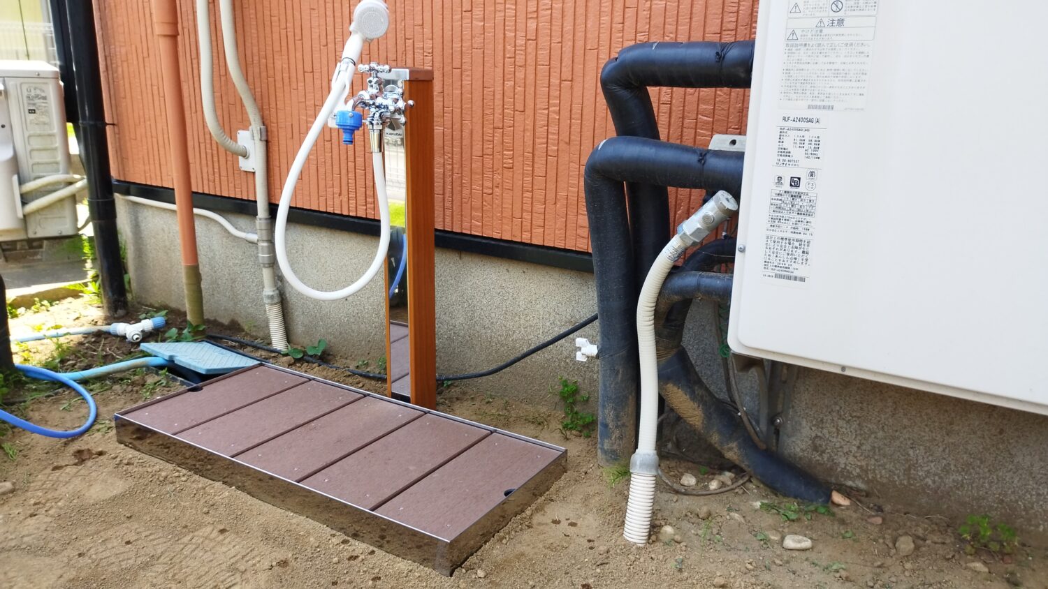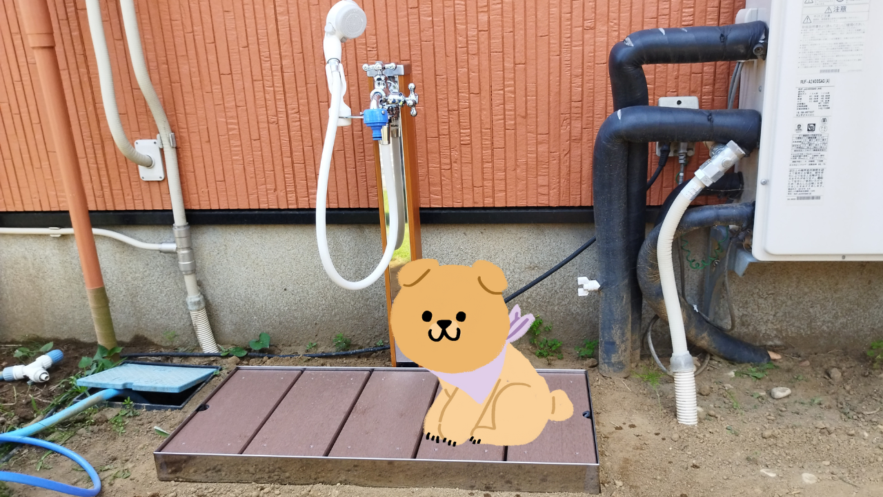 ペットのシャワー、泥落としがしやすい水栓とパンです。