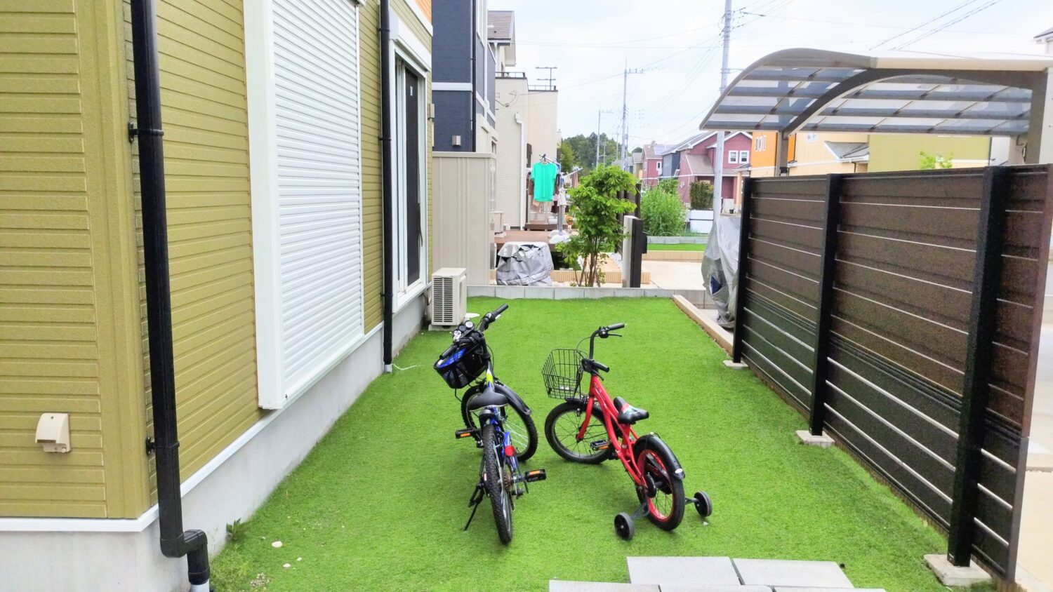 テラス下のコンクリートの手前側は、自転車が乗り入れやすいよう法面になっています。